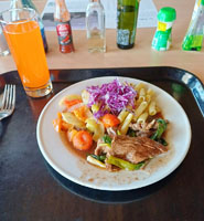 Po tomto dobrodružném výletu jednoho z členů už všichni zůstali na La Silla. Tam jejich pobyt zpříjemňovala výtečná kuchyně, která má tu nejlepší pověst zcela právem. Je o ní známé, že je mnohem lepší než kuchyně na sousední observatoři Las Campanas. „Snídaně probíhala ve formě švédských stolů. V kuchyni na objednání připravovali míchaná vajíčka (huevos revueltos) nebo volská oka (huevo frito) v požadovaném počtu. Zajímavostí je, že většina pečiva byla sladká, s výjimkou toustových chlebů. K obědu pak bylo na výběr obvykle z 5 až 6 druhů pokrmů, včetně vegetariánských variant. Samozřejmostí byly čerstvé ryby (např. losos). Kuchyně byla dost přizpůsobená Evropanům, takže klasický jihoamerický steak jsme zažili pouze dvakrát. K večeři bylo k dispozici podobné menu, počet druhů pokrmů byl nižší (obvykle 2-3). Večeře zůstávala k dispozici nočním pozorovatelům, takže bylo možné se zastavit na druhou večeři i kolem půlnoci. Bonusem k obědům a večeřím byl široký výběr zákusků, většinou připravovaných na místě,“ popisuje Jakub.
