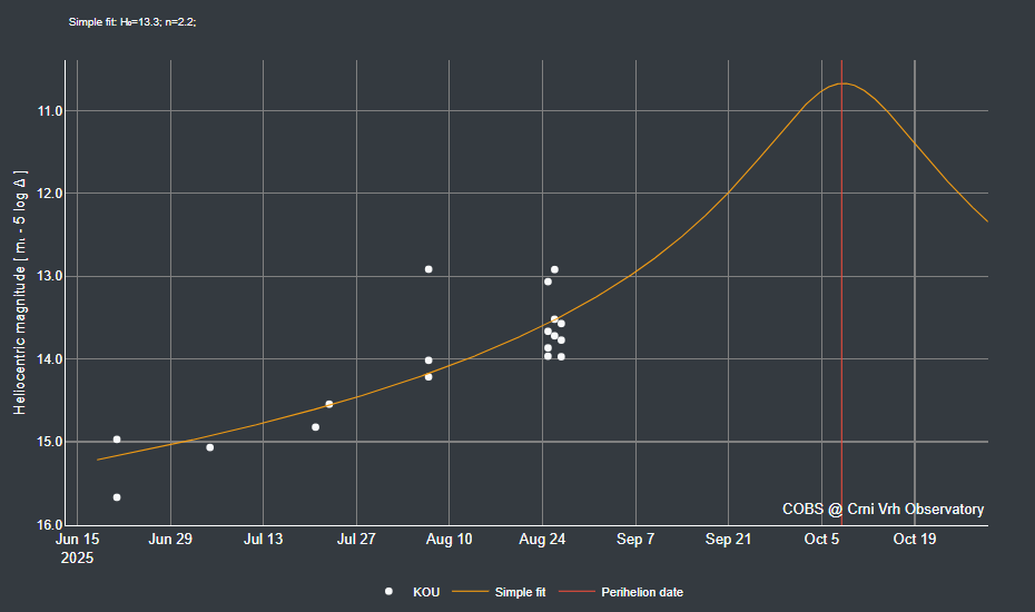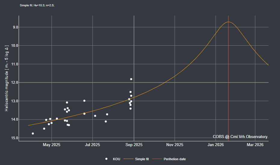 | Obr. 2: Předpokládaný vývoj heliocentrické jasnosti komety C/2025 K1 (ATLAS) založený na fotometrických měřeních jasnosti komety na Hvězdárně Valašské Meziříčí. Autor: COBS, Crni Vrh Observatory |