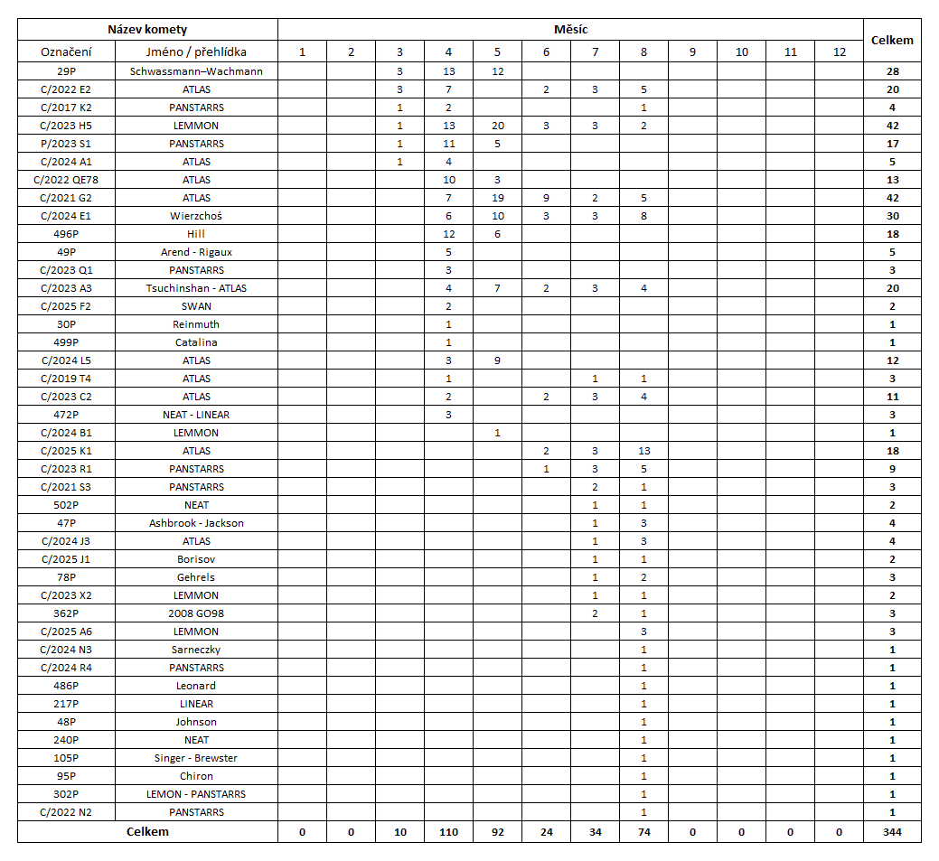 V červenci 2025 bylo ve 4 pozorovacích nocích pořízeno celkem 34 fotometrických měření jasností komet, v srpnu 2025 pak bylo v 5 pozorovacích nocích pořízeno 74 fotometrických měření jasností komet. Nejvíce měření měla provedena kometa C/2025 K1 (ATLAS) se 13 měřeními, následuje kometa C/2024 E1 (Wierzchoś) s 8 měřeními a komety C/2021 G2 (ATLAS), C/2022 E2 (ATLAS) a C/2023 R1 (PANSTARRS) s 5 měřeními (Tab. 1). Nejjasnější zaznamenanou kometou byla C/2025 A6 (LEMMON) s jasností +11,9m (s filtrem „r“ pak +11,2m), nejslabší pak kometa C/2019 T4 (ATLAS) s jasností +19,6m.