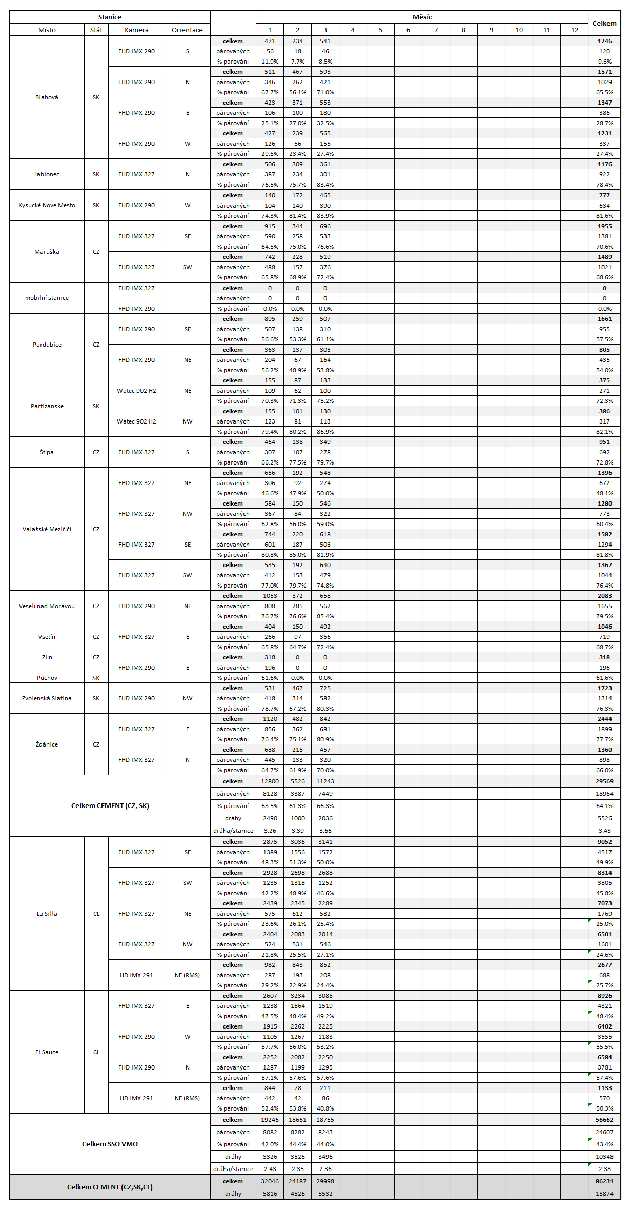 V lednu 2026 bylo kamerami sítě CEMeNt (Central European Meteor Network) a SSO VMO (Southern Spectroscopic Observatory of the Valašské Meziříčí Observatory) zaznamenáno 32 046 jednostaničních meteorů, jejichž kombinací vzniklo 5 816 vícestaničních drah. Kamery sítě CEMeNt zaznamenaly 12 800 jednostaničních meteorů, jejichž kombinací vzniklo 2 490 vícestaničních drah (Obr. 4 a 5), kamery sítě SSO VMO zaznamenaly 19 246 jednostaničních meteorů, jejichž kombinací vzniklo 3 326 vícestaničních drah (Obr. 6 a 7). K dnešnímu datu nejsou do zpracování zahrnuta pozorování ze stanic z vnějšího perimetru sítě, a to z Rokycan (CZ), Plzně (CZ) a Karlových Varů (CZ), jejichž zpracování není dokončeno.
