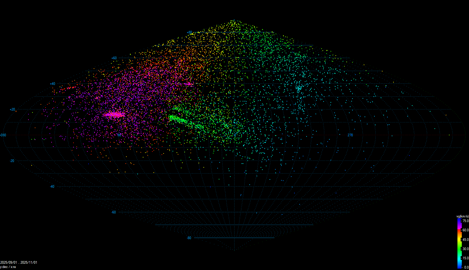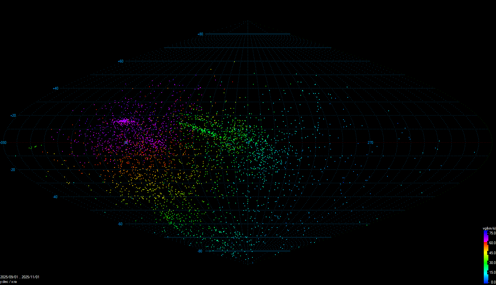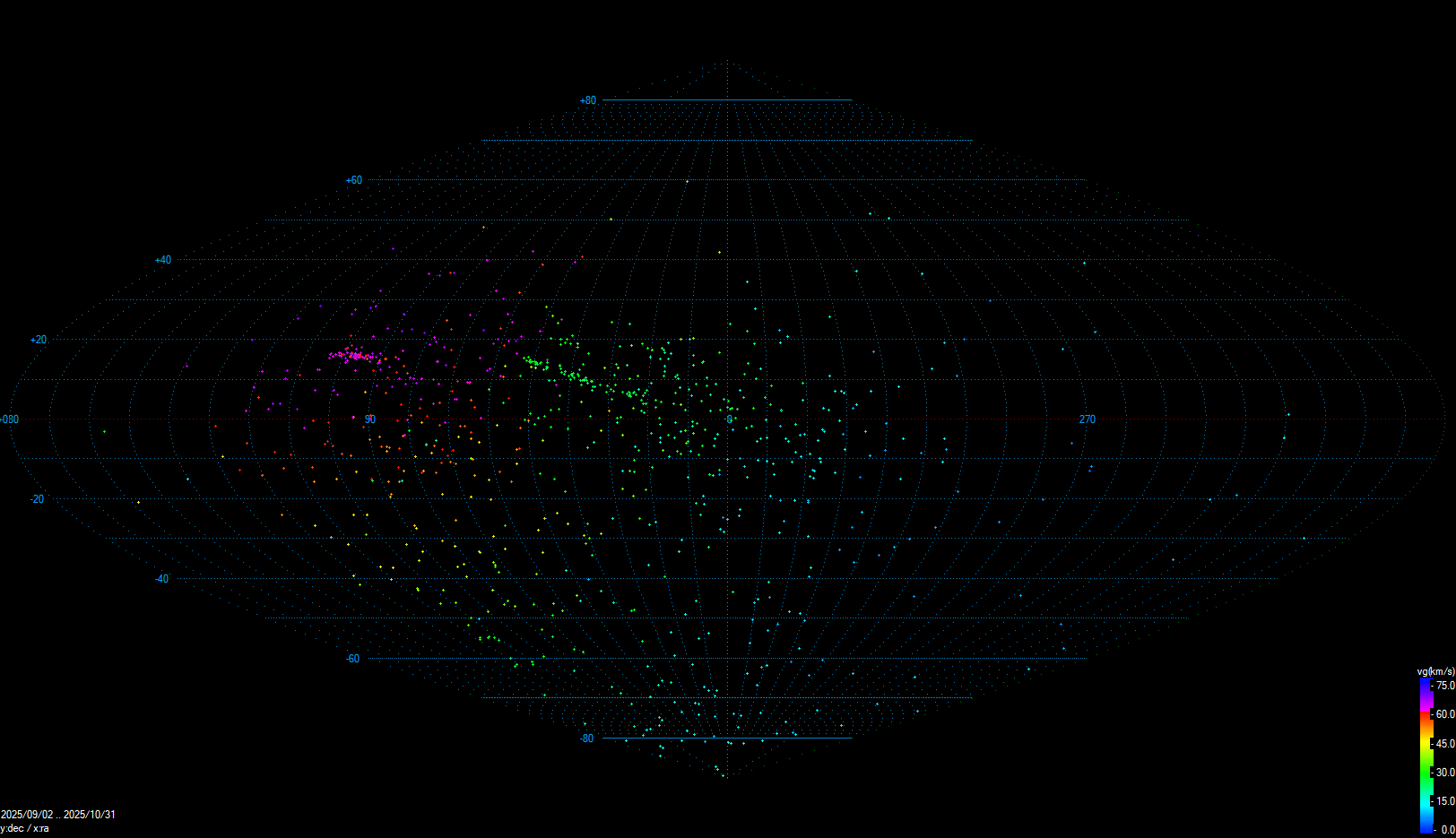 Nejvíce vícestaničních drah v rámci sítě SSO VMO patří ke sporadickému pozadí (3 490 drah), následuje meteorický roj Orionid (ORI, 116 drah), jižních Taurid (STA, 103 drah, Obr. 11), severních delta Piscid (NPI, 39 drah), severních Taurid (NTA, 33 drah), jižních delta Piscid (SPI, 23 drah), A Carinid (16 drah, Obr. 12) a pak následují další slabší meteorické roje. Počet jednostaničních meteorů (stejně jako vícestaničnch drah) je v září a říjnu nejnižší v rámci sítě SSO VMO za celou dobu její existence od června 2025, červenec pak byl srovnatelný s červnem. Efektivita párování poklesla v září na 38,5 % a v říjnu na 29,0 %. Poměr stanice/dráha vzrostl na 2,44 stanice na dráhu v září, respektive na 2,51 v říjnu 2025. Celkem bylo v letošním roce doposud (k 31. 10. 2025) zaznamenáno 92 180 jednostaničních meteorů, jejichž kombinací vzniklo 14 364 vícestaničních drah (Tab. 1).