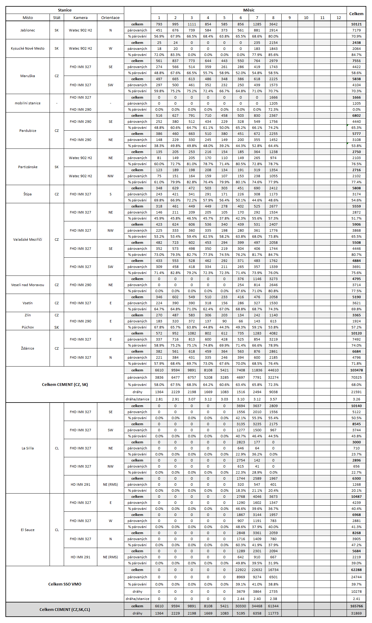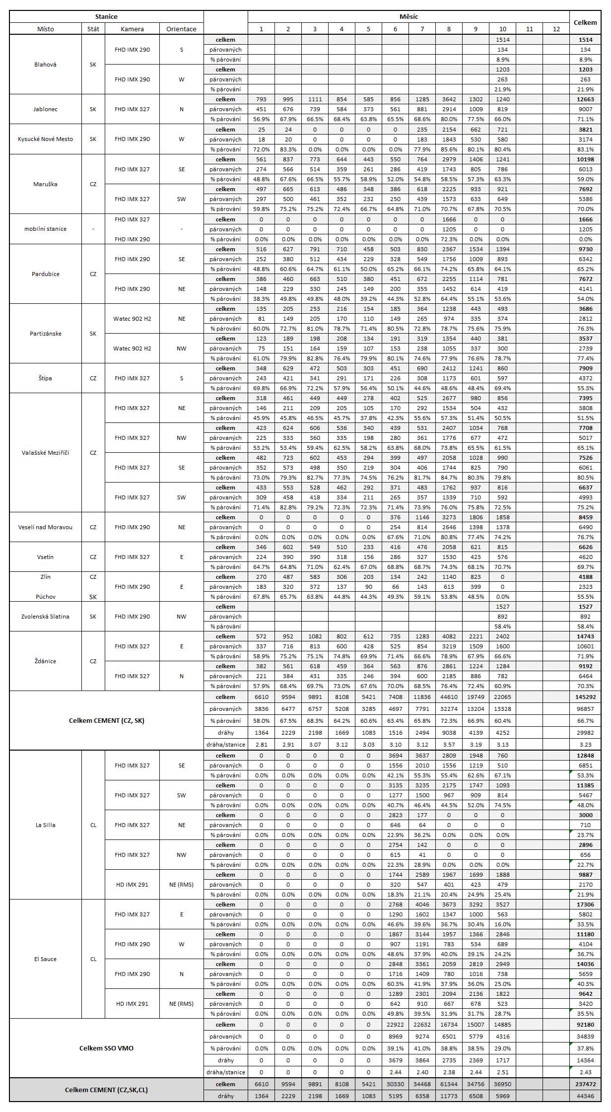 V říjnu 2025 bylo kamerami sítě CEMeNt (Central European Meteor Network) a SSO VMO (Southern Spectroscopic Observatory of the Valašské Meziříčí Observatory) zaznamenáno 36 950 jednostaničních meteorů, jejichž kombinací vzniklo 5 969 vícestaničních drah. Kamery sítě CEMeNt zaznamenaly 22 065 jednostaničních meteorů, jejichž kombinací vzniklo 4 252 vícestaničních drah (Obr. 3 a 4), kamery sítě SSO VMO zaznamenaly 14 885 jednostaničních meteorů, jejichž kombinací vzniklo 1 717 vícestaničních drah (Obr. 5-8). K dnešnímu datu nejsou do zpracování zahrnuta pozorování ze stanic z vnějšího perimetru sítě, a to z Rokycan (CZ), Plzně (CZ) a Karlových Varů (CZ), jejichž zpracování není dokončeno.