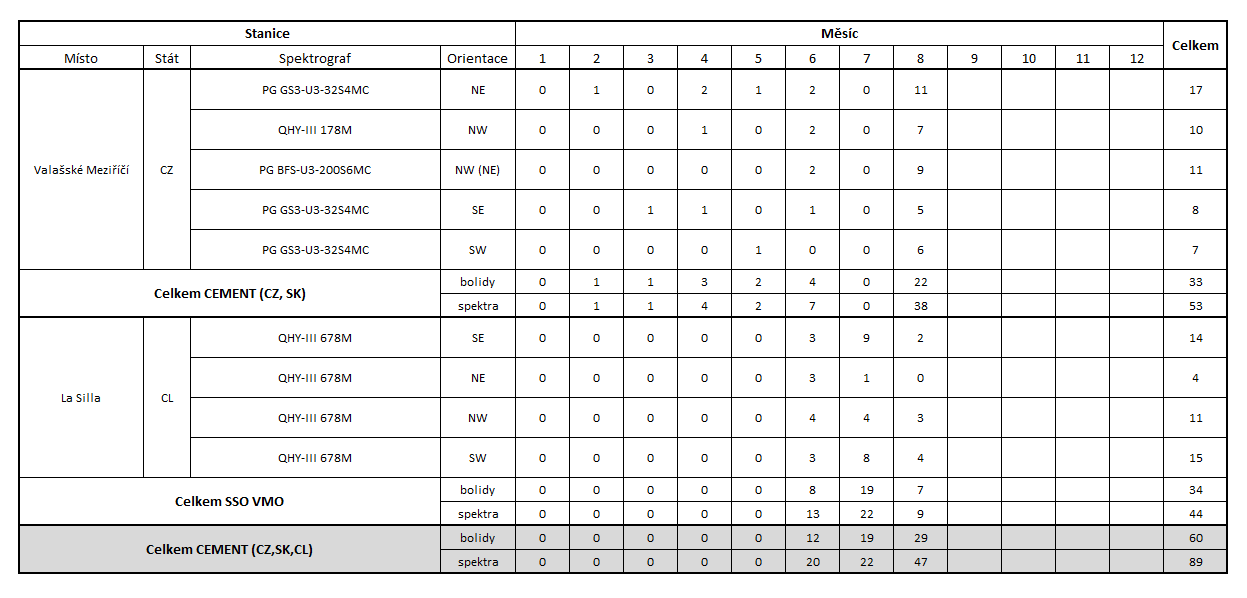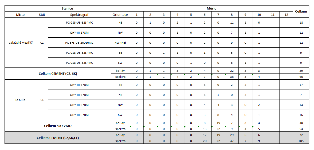 Na Hvězdárně Valašské Meziříčí, v rámci sítě CEMeNt, jsou v současné době osazeny 3 spektrografy s monochromatickými CMOS kamerami PointGrey Grasshoper3 GS3-U3-32S4M-C (2048 × 1536 px), skutečné rozlišení zaznamenaného spektra meteoru (1. řádu spektra) dosahuje průměrně 0,48 nm/px. Tyto spektrografy jsou orientovány ve směrech SE, SW a NE, ve směru NW je osazen spektrograf s monochromatickou CMOS kamerou QHY-III 178M (3072 × 2048 px). Skutečné rozlišení zaznamenaného spektra meteoru (1. řádu spektra) dosahuje u spektrografu QHY-III 178M průměrně 0,35 nm/px. V rámci testovacího provozu je osazen spektrograf ve směru NEN, který je tvořen monochromatickou CMOS kamerou Flir BFS-U3-200S6M-C (5472 × 3648 px), skutečné rozlišení zaznamenaného spektra meteoru (1. řádu spektra) dosahuje průměrně 0,19 nm/px. . V září a říjnu bylo spektrografy na Hvězdárně Valašské Meziříčí zaznamenáno 7 spekter od 6 individuálních bolidů (Tab. 2).