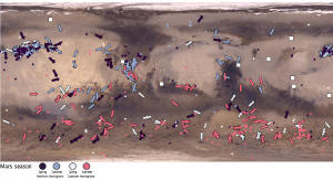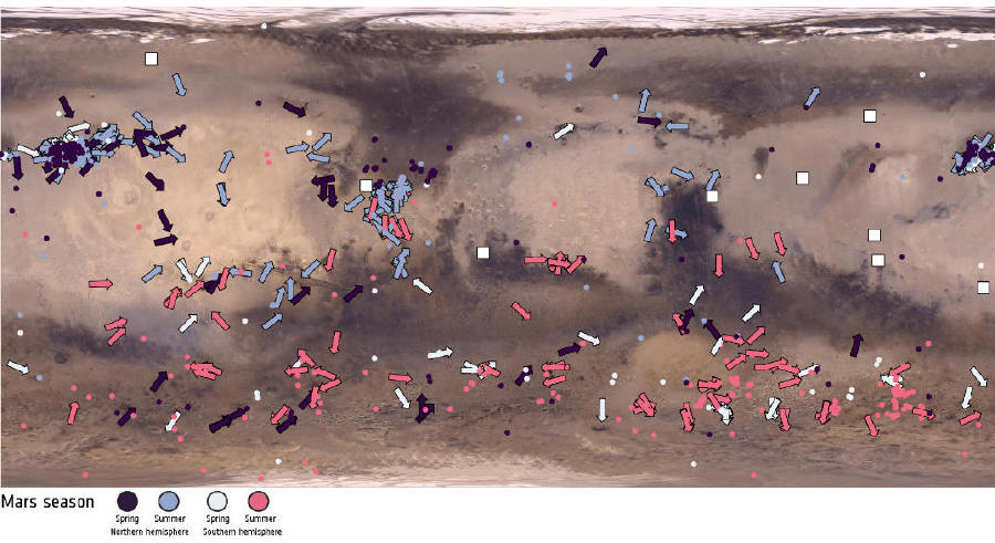 Mapa ukazuje umístění všech 1039 prachových vírů a směr pohybu 373 z nich. Potvrzuje, že ačkoliv se prachové víry vyskytují po celém Marsu, dokonce i na jeho vysokých sopkách, mnoho z nich vzniklo v určitých „zdrojových oblastech“. Například mnoho z nich se shlukovalo v Amazonis Planitia (vlevo nahoře na mapě), obrovské oblasti Marsu pokryté tenkou vrstvou prachu a písku.