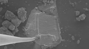 Mikroskopická částice asteroidu Bennu, kterou na Zemi přivezla mise OSIRIS-REx, je na připojeném obrázku manipulována pod transmisním elektronovým mikroskopem. Aby vědci mohli fragment přesunout k další analýze, nejprve jej vyztužili tenkými proužky platiny (tvar „L“ na povrchu částice) a poté k němu přivařili wolframovou mikrojehlu. Fragment asteroidu měří 30 mikrometrů v průměru.