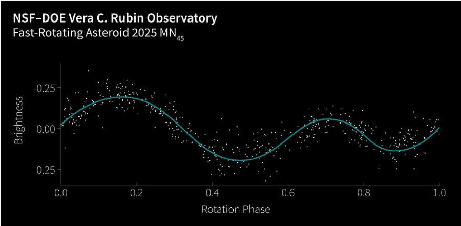 Na zveřejněném obrázku je světelná křivka asteroidu 2025 MN45. Osa y znázorňuje jasnost asteroidu a osa x jeho fázi, neboli polohu v rotaci. Výsledná křivka zobrazuje kolísavou jasnost asteroidu během jeho rotace. Světelné křivky mohou vědcům pomoci určit rotační periodu asteroidu (celkovou dobu potřebnou k dokončení jedné otočky), velikost, tvar a povrchové vlastnosti.