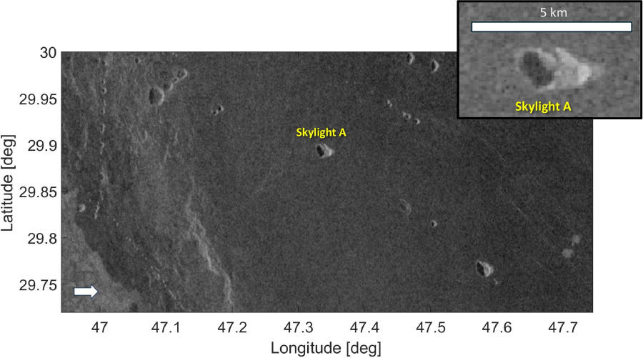 Radarový snímek Venuše byl pořízen pomocí radaru sondy Magellan (Magellanův radarový systém – mozaika zleva v plném rozlišení) zobrazující několik řetězců lávových jam a identifikovaný světlík (skylight) označený jako Skylight A, který potenciálně umožňuje přístup k podpovrchové prázdné dutině. Bílá šipka označuje směr pohledu radarem.