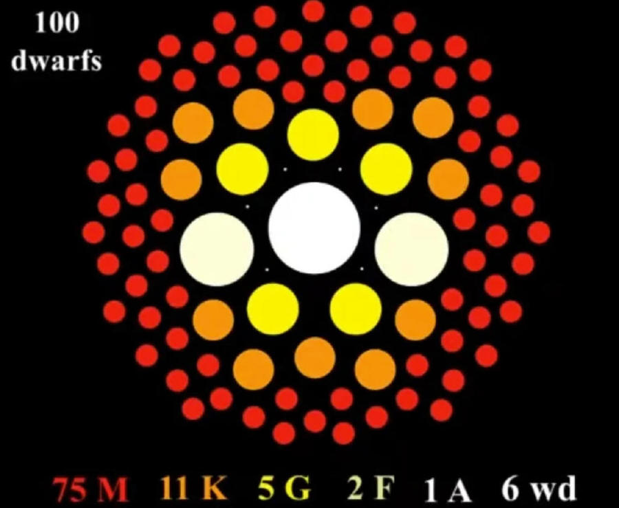 Tato grafika pomáhá ilustrovat trpasličí hvězdy do 10 parseků od Slunce. Zobrazuje počet jednotlivých typů hvězd na každých 100 hvězd v okolí. Hvězdy typu K jsou druhým nejpočetnějším typem, přesto jsou v průzkumech exoplanet nedostatečně zastoupeny.