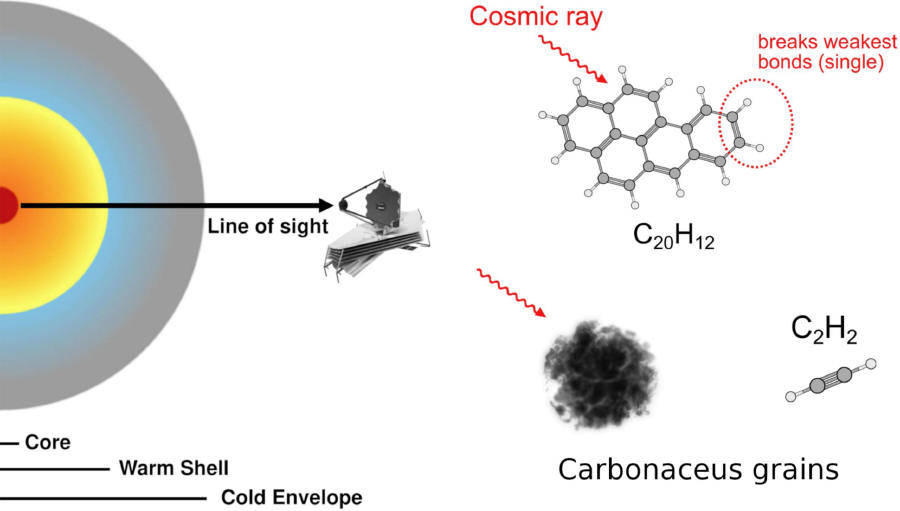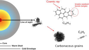 Na obrázku je galaktické jádro a chemie uhlovodíků v galaxii IRAS 07251–0248. Vlevo: Schéma jádra, zobrazující velmi horkou centrální složku (tmavě červená), teplou vrstvu s molekulami v plynné fázi (oranžovožlutá) a chladný obal s molekulami v pevné fázi (modrošedá). Vpravo: Koncepční ilustrace toho, jak kosmické záření zpracovává uhlíkatá zrna a PAH, čímž vytváří pozorovanou chemii bohatou na uhlovodíky.