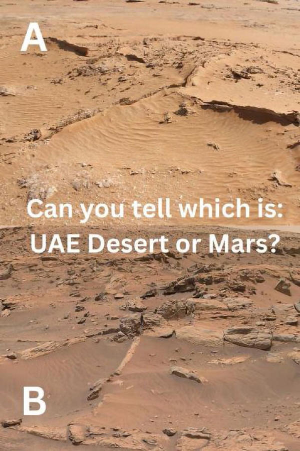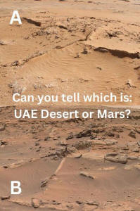 Dokážete rozeznat mezi obrázky A a B, na kterém je poušť ve Spojených arabských emirátech a která se nachází na Marsu? (Odpověď: A = poušť Spojených arabských emirátů, B = Mars).