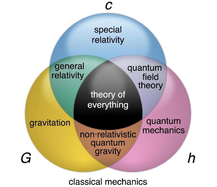 Kterékoliv dvě z těchto teorií lze sjednotit do konzistentního modelu. Spojte speciální relativitu s gravitací a získáte obecnou relativitu, která popisuje, jak je gravitace zakřivením časoprostoru. Spojte speciální relativitu s kvantovou mechanikou a získáte kvantovou teorii pole. Spojte kvantovou mechaniku a Newtonovu gravitaci a získáte slabou kvantovou gravitaci, která dokáže popsat, jak se atomy a molekuly chovají ve slabém gravitačním poli, jako je to zemské.