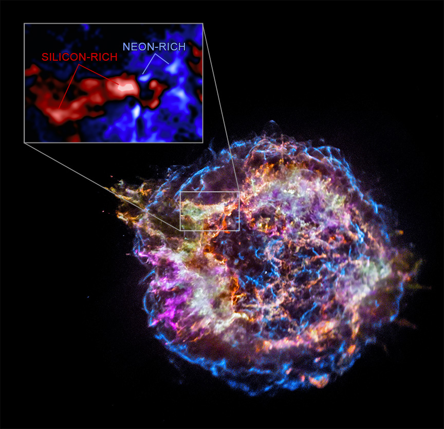Vložený obrázek vlevo nahoře zobrazuje menší oblast Cas A. Ta odhaluje data shromážděná družicí Chandra, která zachycují relativní množství křemíku a neonu. Oblasti s velkým množstvím křemíku, ale menším množstvím neonu, jsou označeny jako bohaté na křemík a chudé na neon a jsou zbarveny červeně. Oblasti, kde Chandra detekuje opak – velké množství neonu, ale menší množství křemíku (bohaté na neon a chudé na křemík) – jsou zbarveny modře.