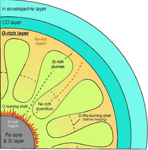 Další obrázek ukazuje průřez hmotnou hvězdou podobnou té, která vytvořila zbytek supernovy Cas A. Cibulovitým vrstvám dominují stále těžší prvky, počínaje vodíkem a sahajícími až k héliu, uhlíku, kyslíku, křemíku a železu ve středu hvězdy. Průřez je zobrazen několik hodin před explozí hvězdy v podobě supernovy. Materiál bohatý na křemík, který vzniká v jaderných reakcích zahrnujících kyslík (v úzké „slupce spalující O“), se vznáší a tlačí ven v oblacích bohatých na křemík, čímž nutí materiál bohatý na neon dále proudit dovnitř. Pohyb těchto materiálů bohatých na křemík a neon narušuje úzkou slupku, kde uhlík a neon procházejí jadernými reakcemi (úzká „slupka spalující C/Ne“).