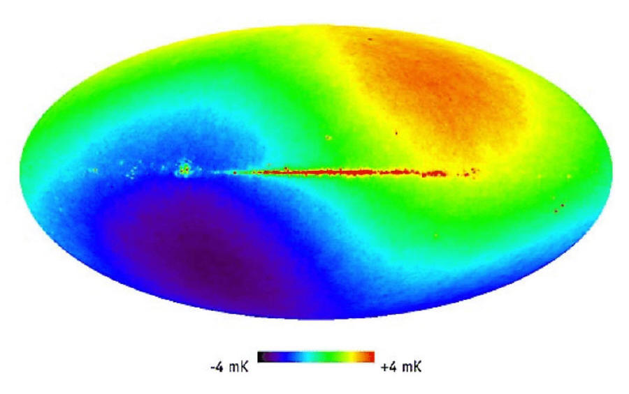Pravděpodobně jste viděli snímky kosmického mikrovlnného pozadí (cosmic microwave background – CMB) z teleskopů Planck nebo WMAP s malými barevnými fluktuacemi, které ukazují lokální změny teploty. Jedná se však o zpracovaný snímek, který koriguje náš pohyb vzhledem k CMB. Nezpracovaná data ukazují jasný dipólový efekt, kdy se CMB v jednom směru jeví jako teplejší a v opačném směru chladnější. To je způsobeno naším relativním pohybem vzhledem k CMB. Na základě zjištěných dat se pohybujeme vesmírem rychlostí přibližně 360 km/s, což je překvapivě rychle.