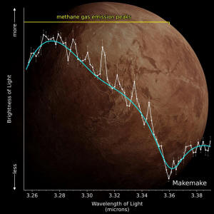 Silvia Protopapaová a kol. použili pozorování Webbova teleskopu (bílá křivka na úvodním obrázku) k detekci metanu na Makemake; ostré emisní píky v blízkosti 3,3 mikronu odhalují metan v plynné fázi nad povrchem Makemake; pro srovnání je překryt model kontinua (azurová); píky emisních plynů jsou identifikovány tam, kde pozorované spektrum stoupá nad kontinuum.