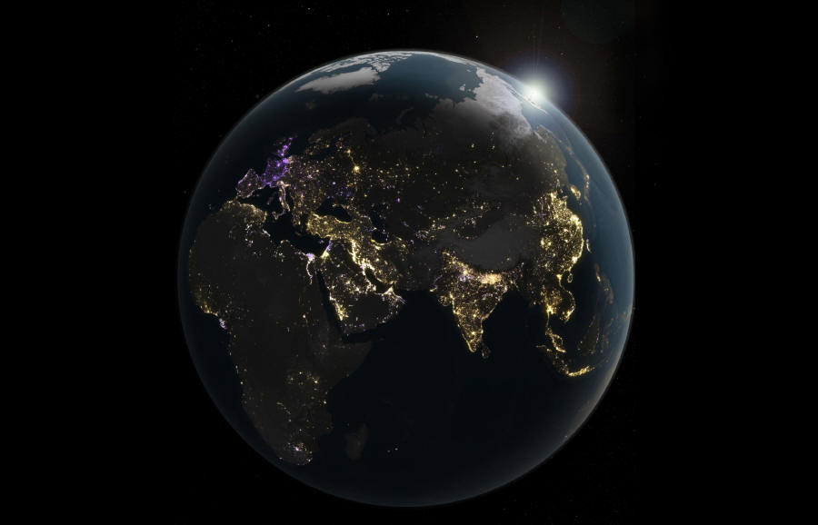 Na obrázku v úvodu článku je noční pohled na Zemi, zachycující lidskou aktivitu na východní polokouli planety prostřednictvím emisí umělého světla. Fotografie, odvozená ze satelitních snímků pořizovaných denně v posledním desetiletí, mapuje dynamiku lidské noční aktivity, přičemž zlaté oblasti zažívají zjasňování, fialové oblasti stmívání a bílé oblasti zažívají obojí.