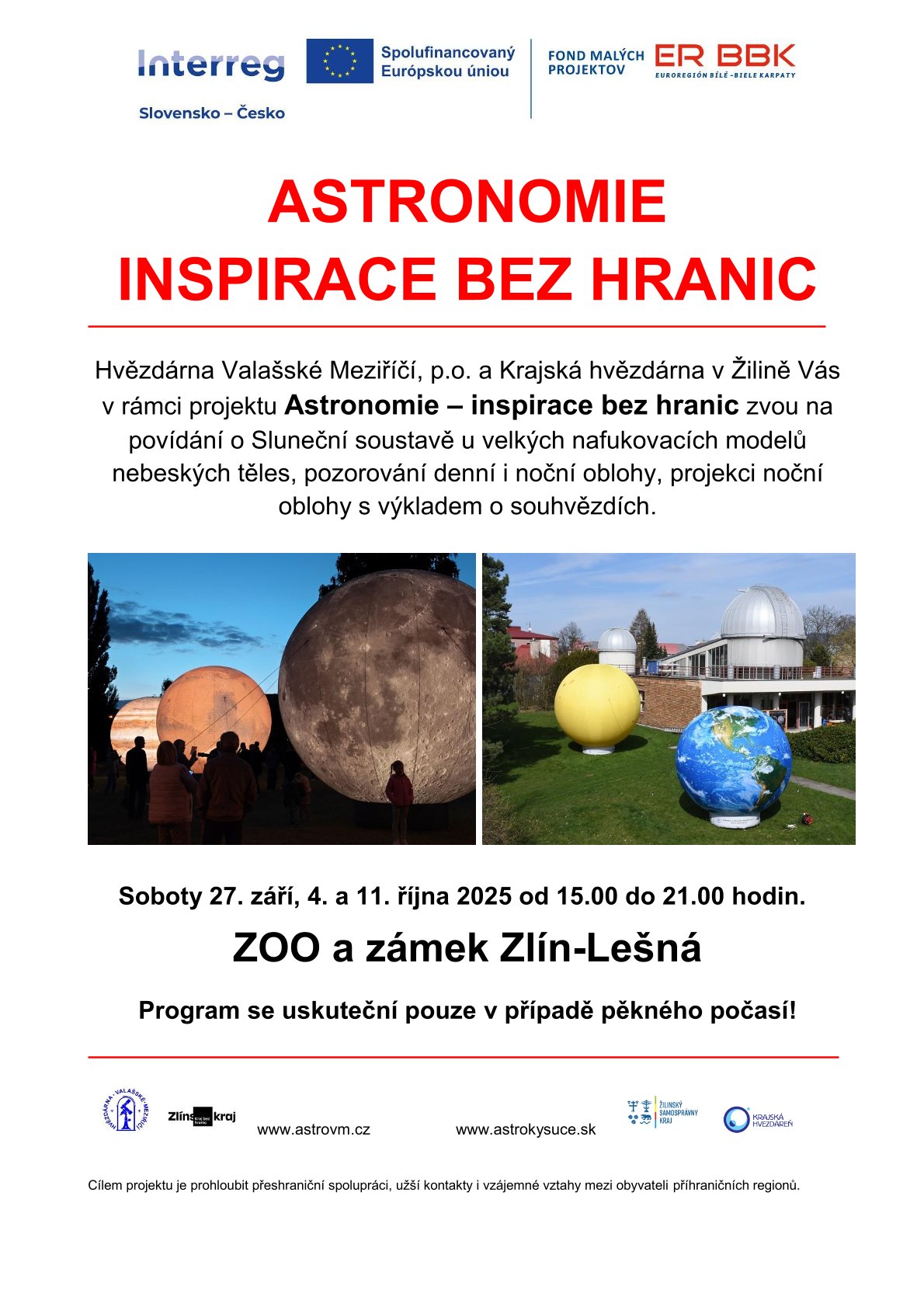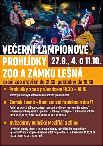 Hvězdárna Valašské Meziříčí, p.o. a Krajská hvězdárna v Žilině Vás v rámci projektu Astronomie – inspirace bez hranic zvou ve spolupráci se ZOO Zlín - Lešná na Večerní lampionové prohlídky zoo a zámku. Akce se uskuteční 27.9.2025 od 18:00 hodin v ZOO Zlín - Lešná. Těšit se můžete na velké nafukovací modely nebeských těles, pozorování noční oblohy a ve společenském prostoru U Supa můžete zavítat na projekci noční oblohy s výkladem o souhvězdích.